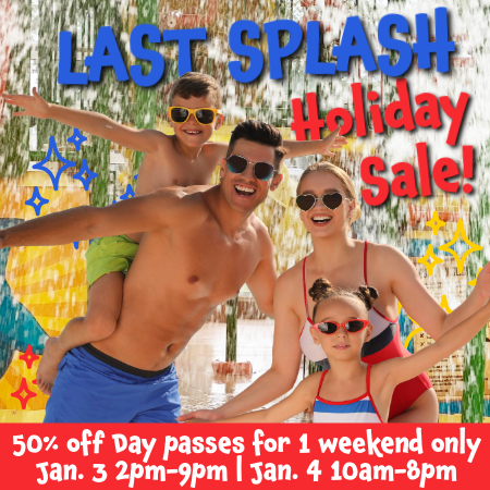 Celebrate one Last Splash of the Holidays with 50% off Waterpark Day Pass Admission: Valid Saturday, January 3 (2pm-9pm) & Sunday, January 4 (10am-8pm)